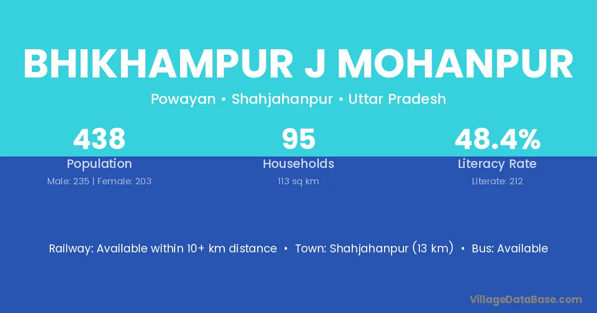 Bhikhampur J Mohanpur village has a total population of 438 people, of which 235 are males and 203 are females.