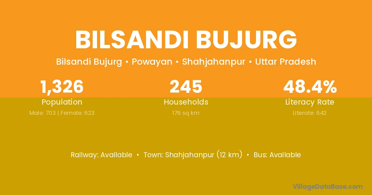 Shahjahanpur (12 km) is the nearest town to Bilsandi Bujurg village for major economic activities and is located approximately 12 km away.
