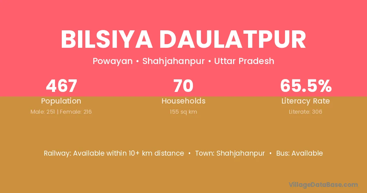 Bilsiya Daulatpur village has a total population of 467 people, of which 251 are males and 216 are females.