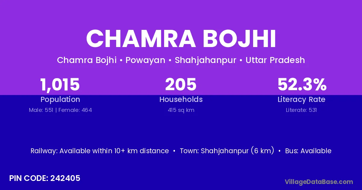 Shahjahanpur (6 km) is the nearest town to Chamra Bojhi village for major economic activities and is located approximately 6 km away.
