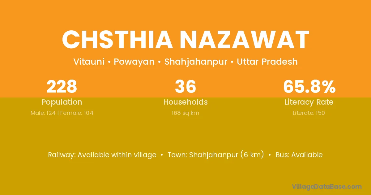 Shahjahanpur (6 km) is the nearest town to Chsthia Nazawat village for major economic activities and is located approximately 6 km away.