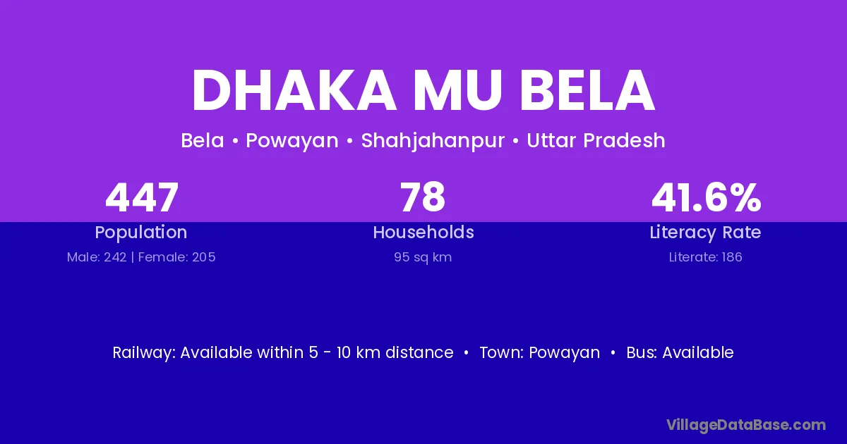 Dhaka Mu Bela village has a total population of 447 people, of which 242 are males and 205 are females.