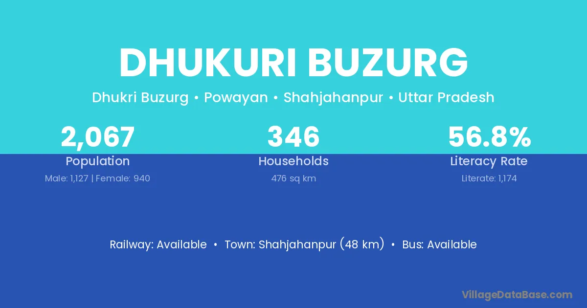 Shahjahanpur (48 km) is the nearest town to Dhukuri Buzurg village for major economic activities and is located approximately 48 km away.