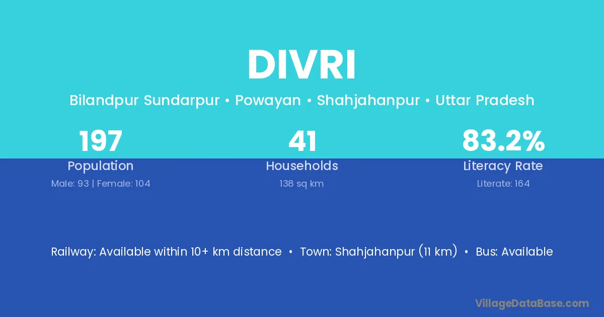 Shahjahanpur (11 km) is the nearest town to Divri village for major economic activities and is located approximately 11 km away.