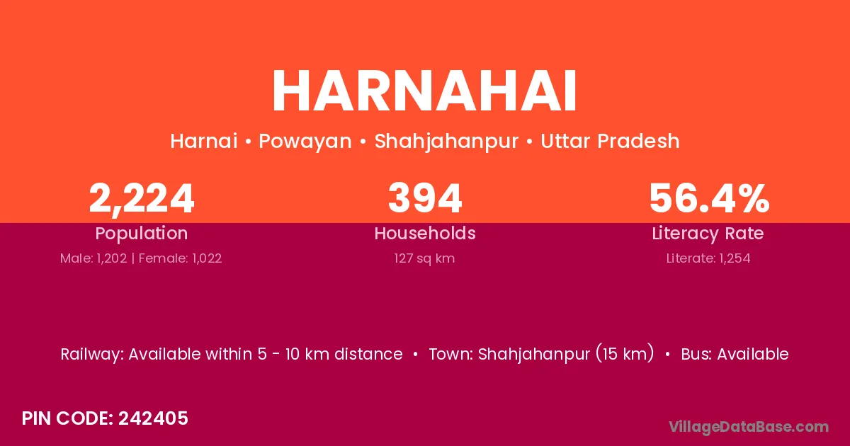 Shahjahanpur (15 km) is the nearest town to Harnahai village for major economic activities and is located approximately 15 km away.