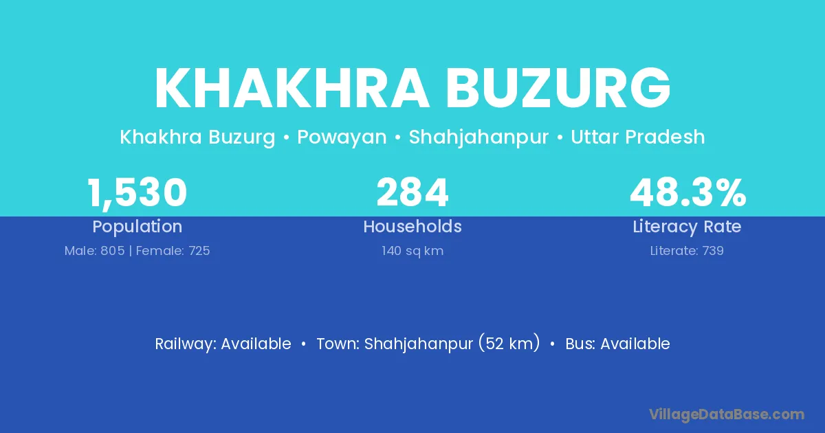 Shahjahanpur (52 km) is the nearest town to Khakhra Buzurg village for major economic activities and is located approximately 52 km away.