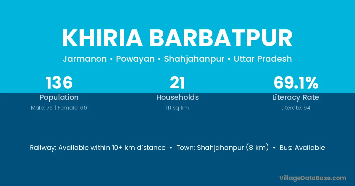 Shahjahanpur (8 km) is the nearest town to Khiria Barbatpur village for major economic activities and is located approximately 8 km away.
