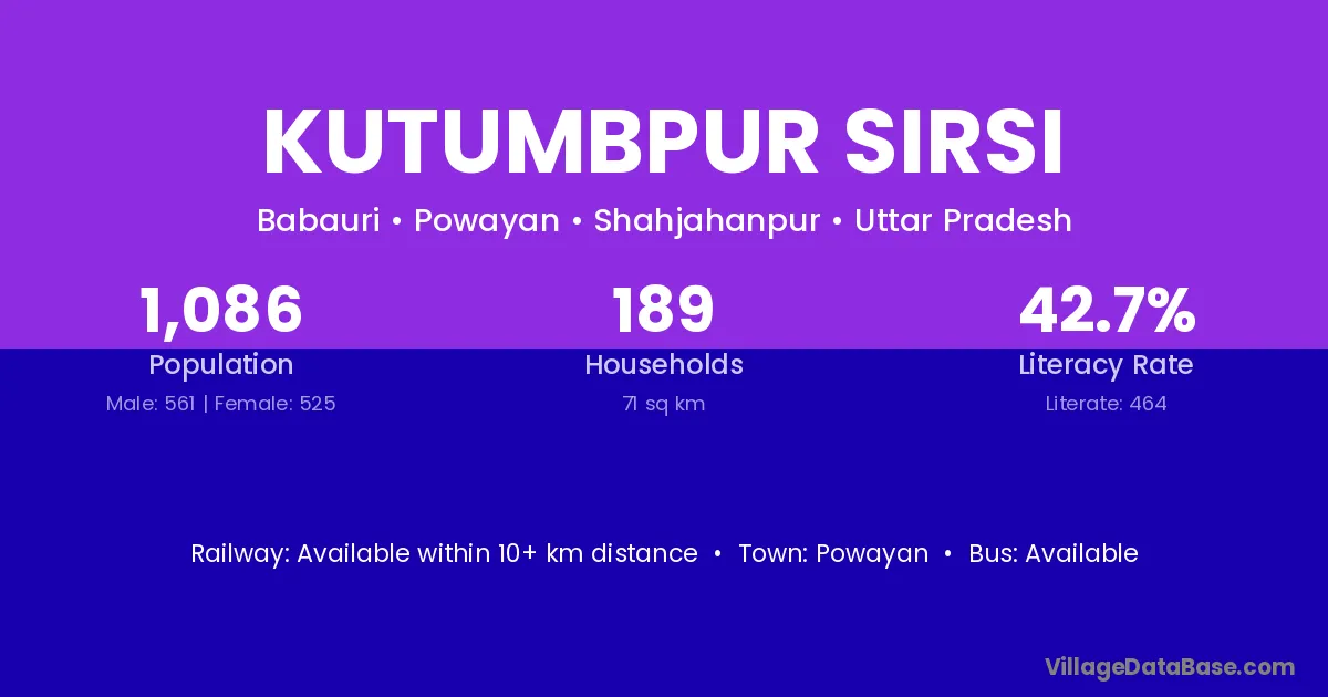 Kutumbpur Sirsi village has a total population of 1,086 people, of which 561 are males and 525 are females.