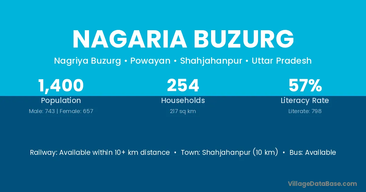 Shahjahanpur (10 km) is the nearest town to Nagaria Buzurg village for major economic activities and is located approximately 10 km away.