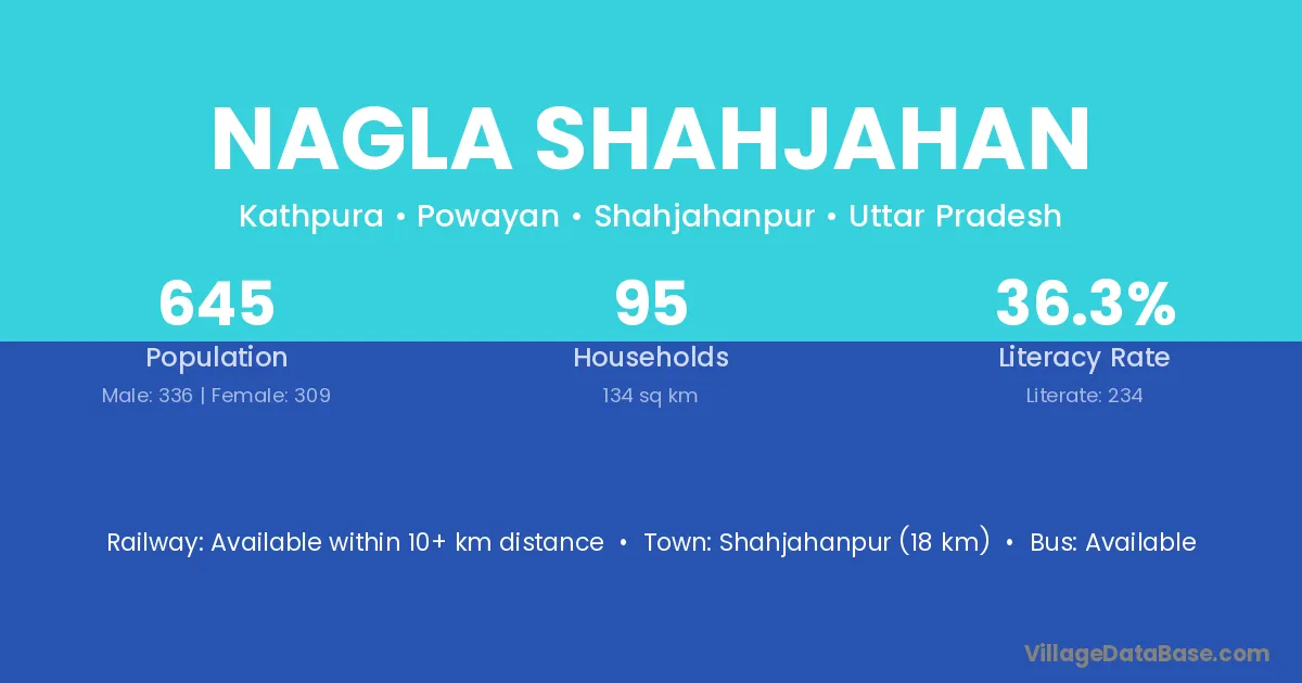 Shahjahanpur (18 km) is the nearest town to Nagla Shahjahan village for major economic activities and is located approximately 18 km away.