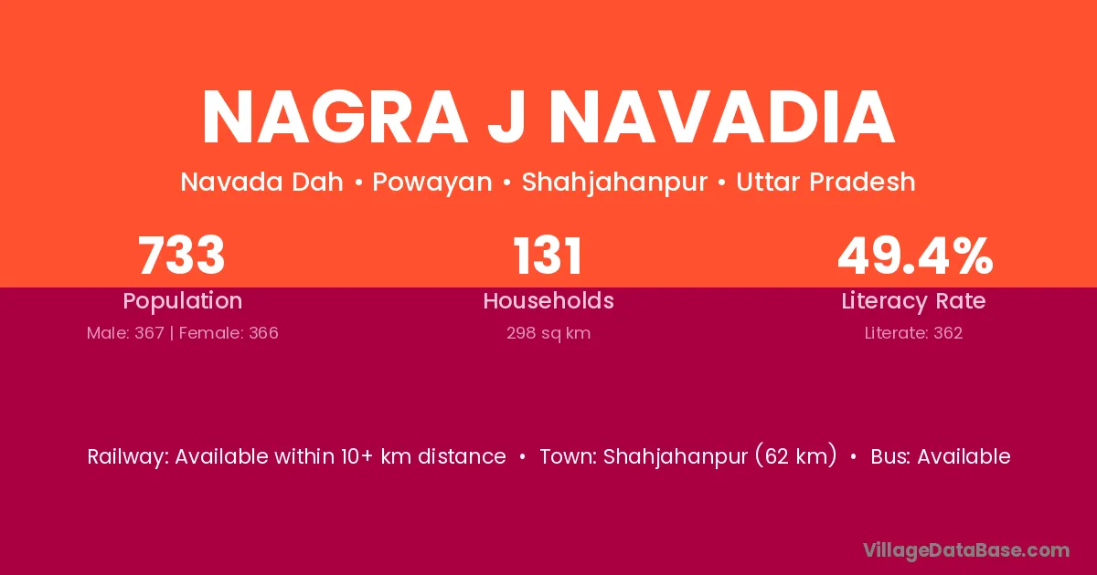 Shahjahanpur (62 km) is the nearest town to Nagra J Navadia village for major economic activities and is located approximately 62 km away.
