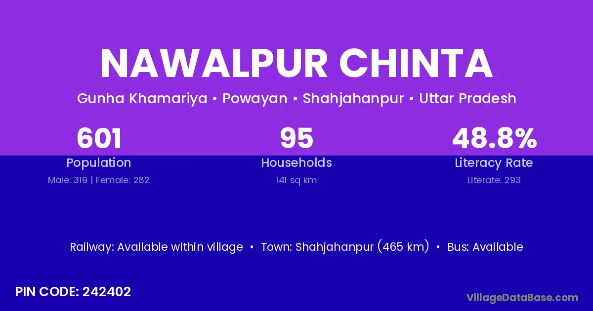 Shahjahanpur (465 km) is the nearest town to Nawalpur Chinta village for major economic activities and is located approximately 465 km away.