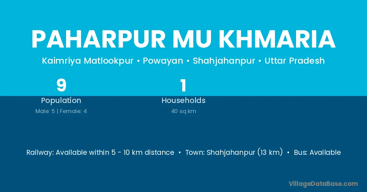 Shahjahanpur (13 km) is the nearest town to Paharpur Mu Khmaria village for major economic activities and is located approximately 13 km away.