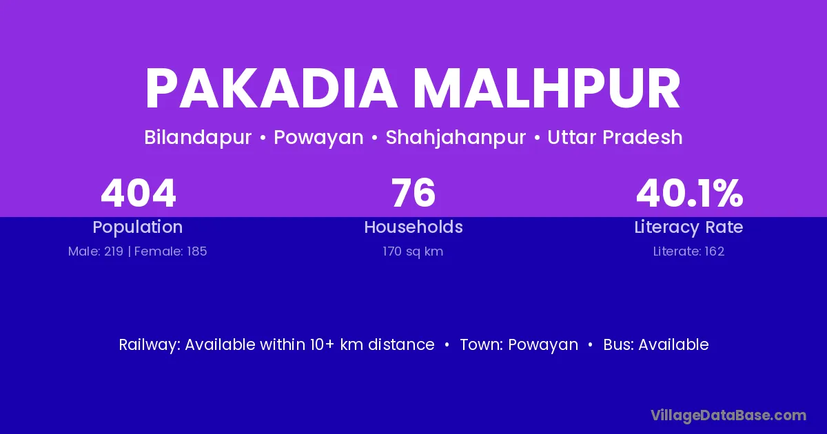 Pakadia Malhpur village has a total population of 404 people, of which 219 are males and 185 are females.