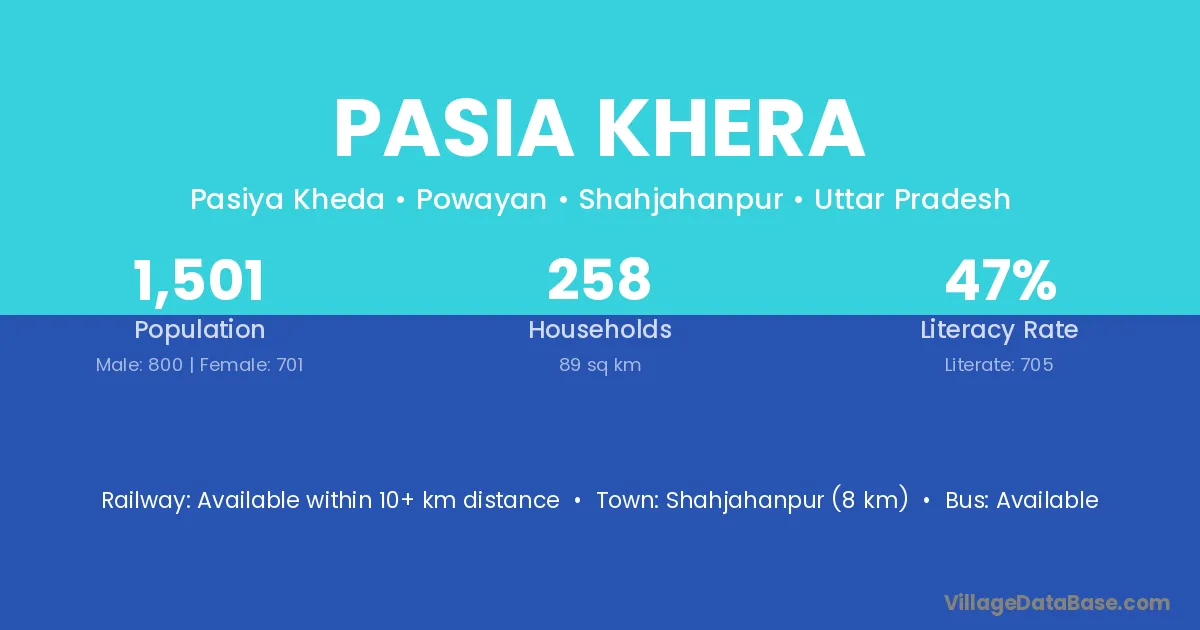 Shahjahanpur (8 km) is the nearest town to Pasia Khera village for major economic activities and is located approximately 8 km away.