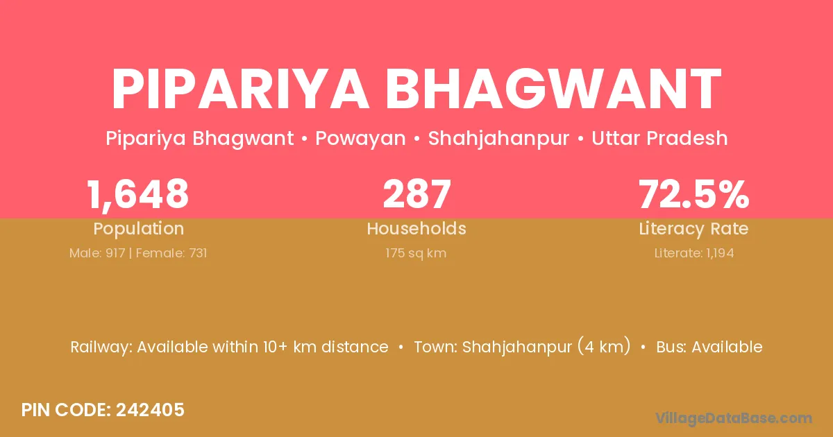 Shahjahanpur (4 km) is the nearest town to Pipariya Bhagwant village for major economic activities and is located approximately 4 km away.