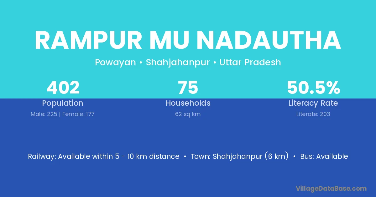 Rampur Mu Nadautha village has a total population of 402 people, of which 225 are males and 177 are females.