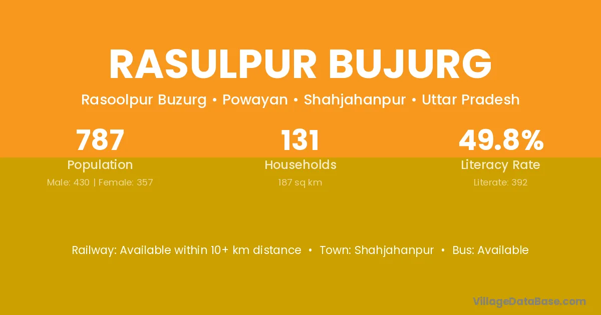 Rasulpur Bujurg village has a total population of 787 people, of which 430 are males and 357 are females.