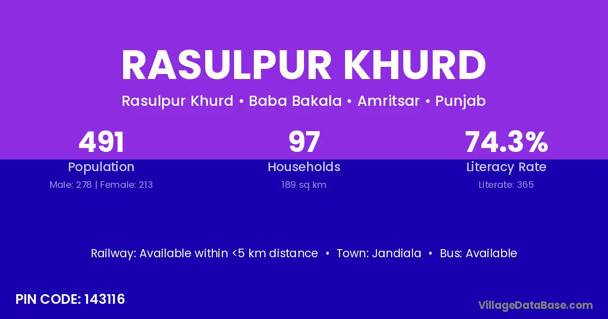 The literacy rate of Rasulpur Khurd village is 53.85%. Male literacy stands at 65.96% and female literacy at 40.91%.