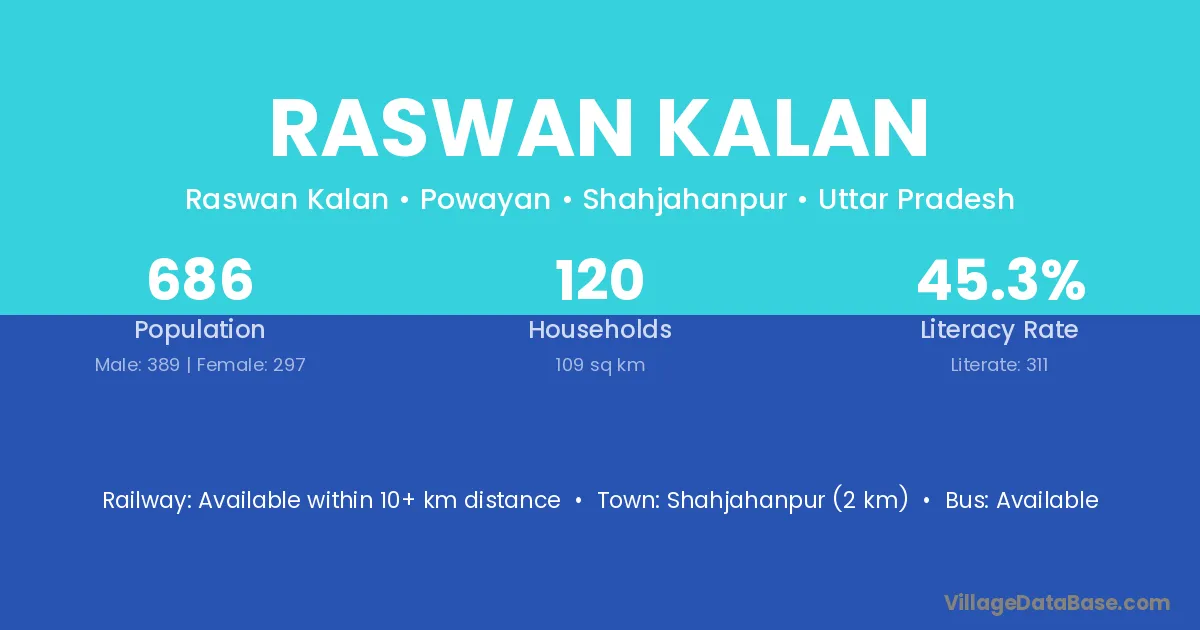 Raswan Kalan village has a total population of 686 people, of which 389 are males and 297 are females.
