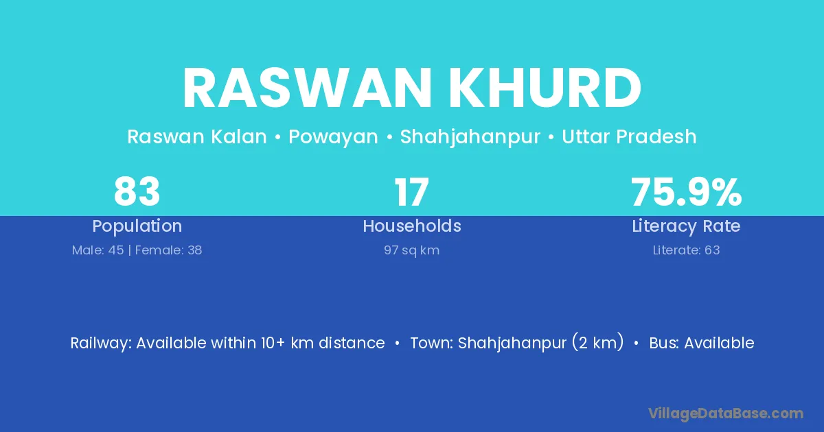 Raswan Khurd village has a total population of 83 people, of which 45 are males and 38 are females.