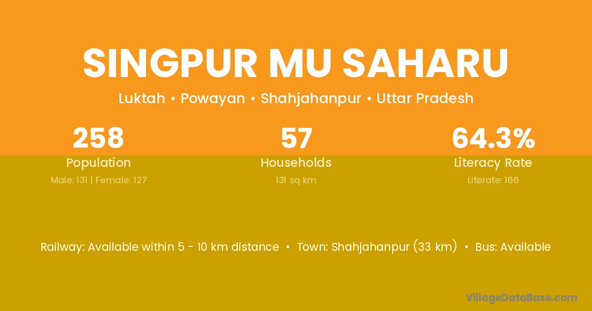 Shahjahanpur (33 km) is the nearest town to Singpur Mu Saharu village for major economic activities and is located approximately 33 km away.