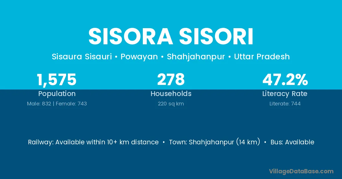 Shahjahanpur (14 km) is the nearest town to Sisora Sisori village for major economic activities and is located approximately 14 km away.