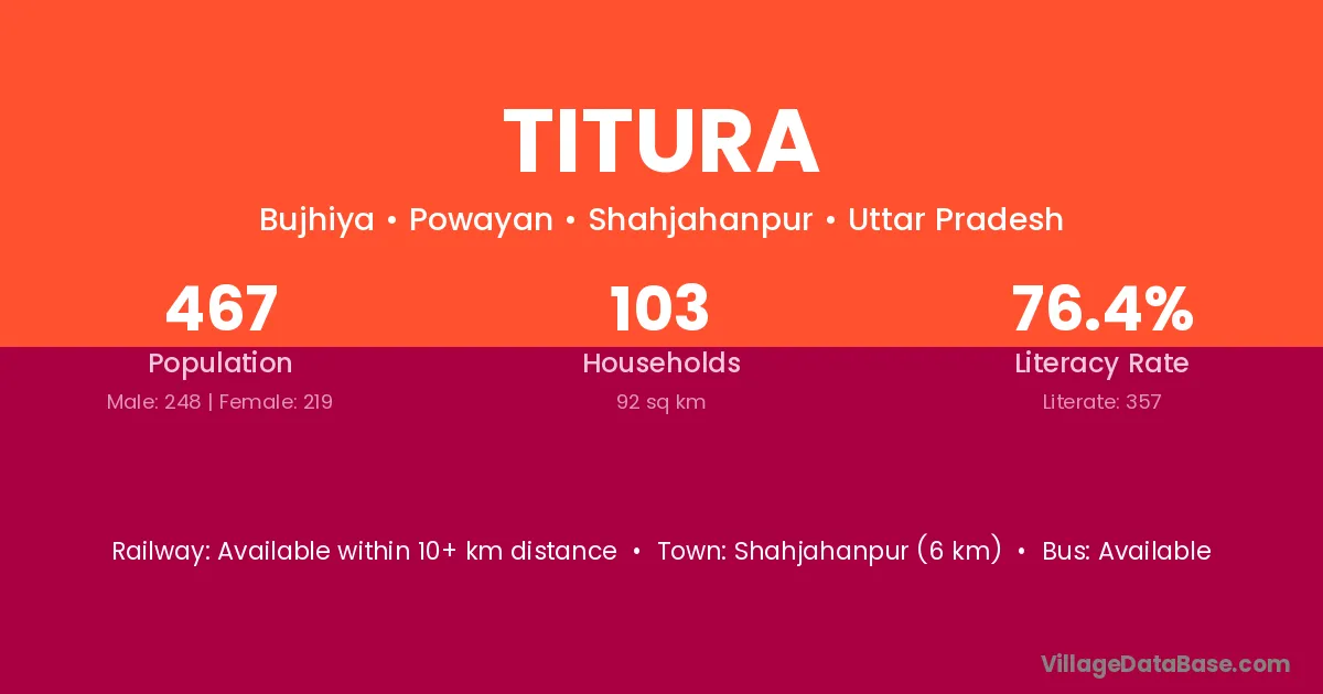 Titura village has a total population of 467 people, of which 248 are males and 219 are females.