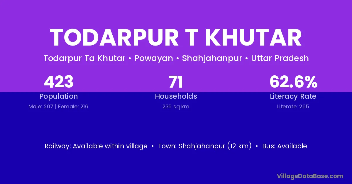 Todarpur T Khutar village has a total population of 423 people, of which 207 are males and 216 are females.