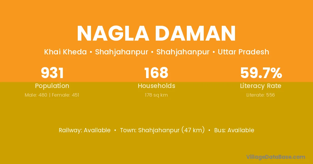 Shahjahanpur (47 km) is the nearest town to Nagla Daman village for major economic activities and is located approximately 47 km away.