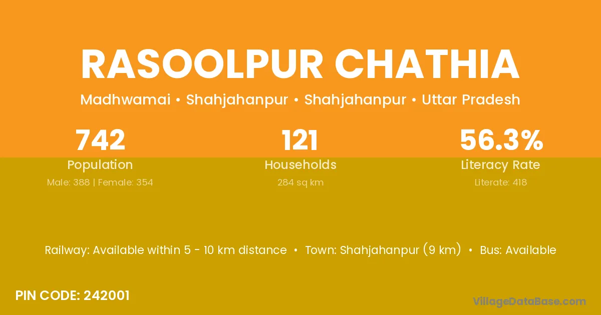 Shahjahanpur (9 km) is the nearest town to Rasoolpur Chathia village for major economic activities and is located approximately 9 km away.