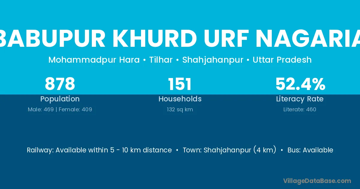 Shahjahanpur (4 km) is the nearest town to Babupur Khurd Urf Nagaria village for major economic activities and is located approximately 4 km away.