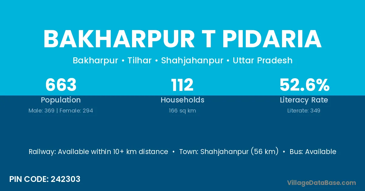 Shahjahanpur (56 km) is the nearest town to Bakharpur T Pidaria village for major economic activities and is located approximately 56 km away.
