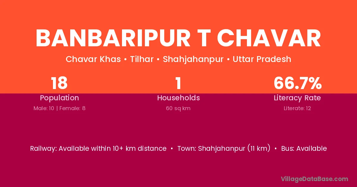 Banbaripur T Chavar village has a total population of 18 people, of which 10 are males and 8 are females.