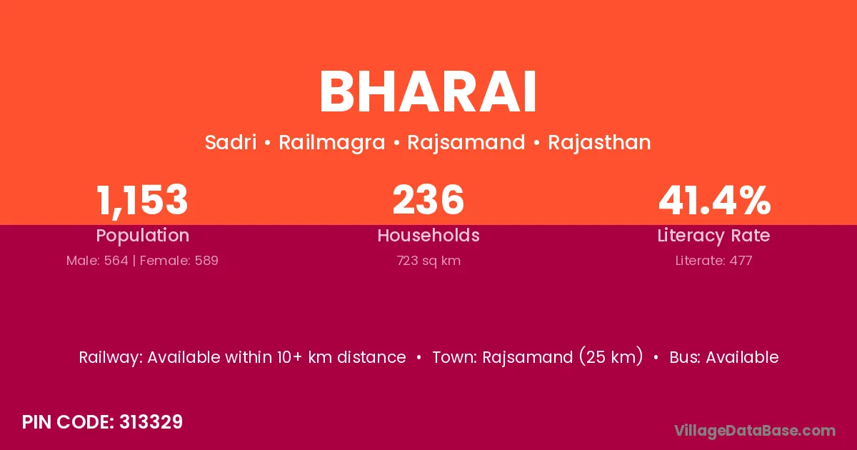 Bharai village has a total population of 1,615 people, of which 874 are males and 741 are females.