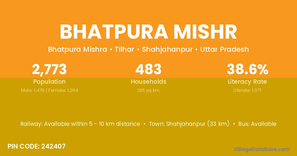 Shahjahanpur (33 km) is the nearest town to Bhatpura Mishr village for major economic activities and is located approximately 33 km away.
