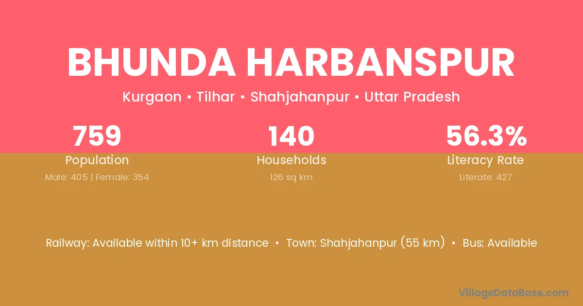 Shahjahanpur (55 km) is the nearest town to Bhunda Harbanspur village for major economic activities and is located approximately 55 km away.