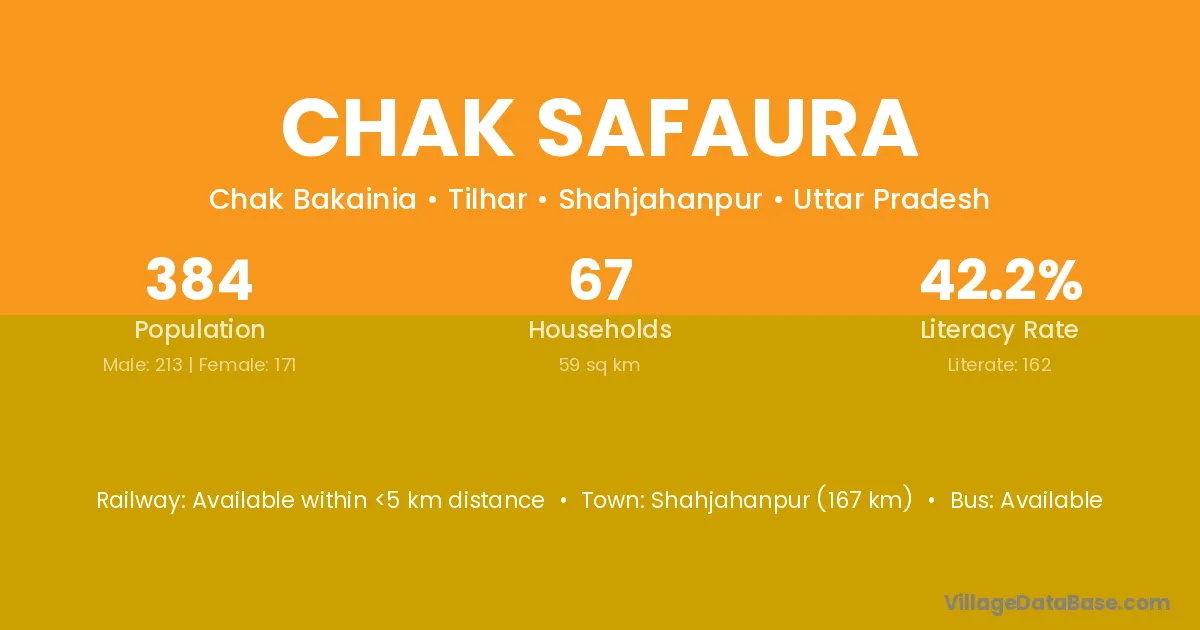 Shahjahanpur (167 km) is the nearest town to Chak Safaura village for major economic activities and is located approximately 167 km away.
