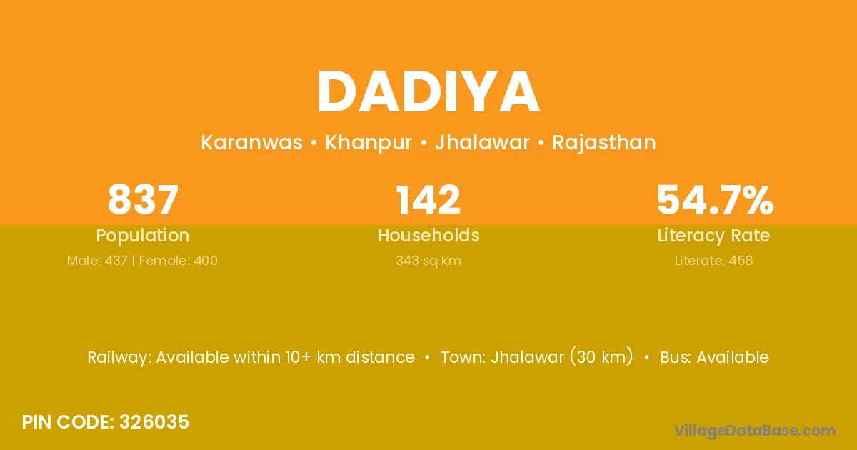 Shahjahanpur (33 km) is the nearest town to Dadiya village for major economic activities and is located approximately 33 km away.