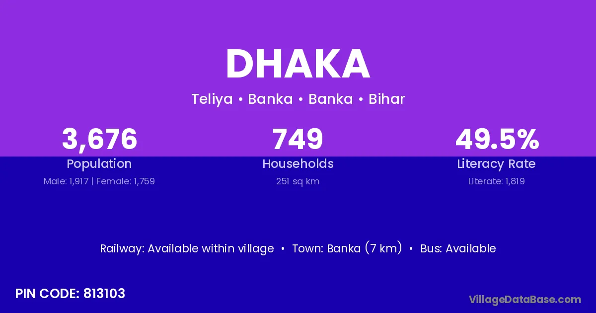 The literacy rate of Dhaka village is 51.97%. Male literacy stands at 61.99% and female literacy at 39.15%.