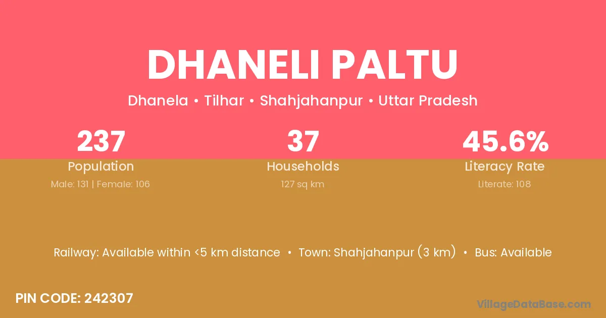 Dhaneli Paltu village has a total population of 237 people, of which 131 are males and 106 are females.