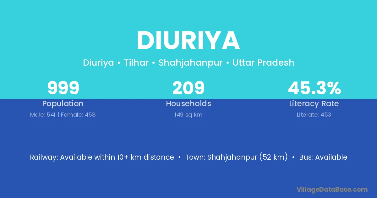 Shahjahanpur (52 km) is the nearest town to Diuriya village for major economic activities and is located approximately 52 km away.