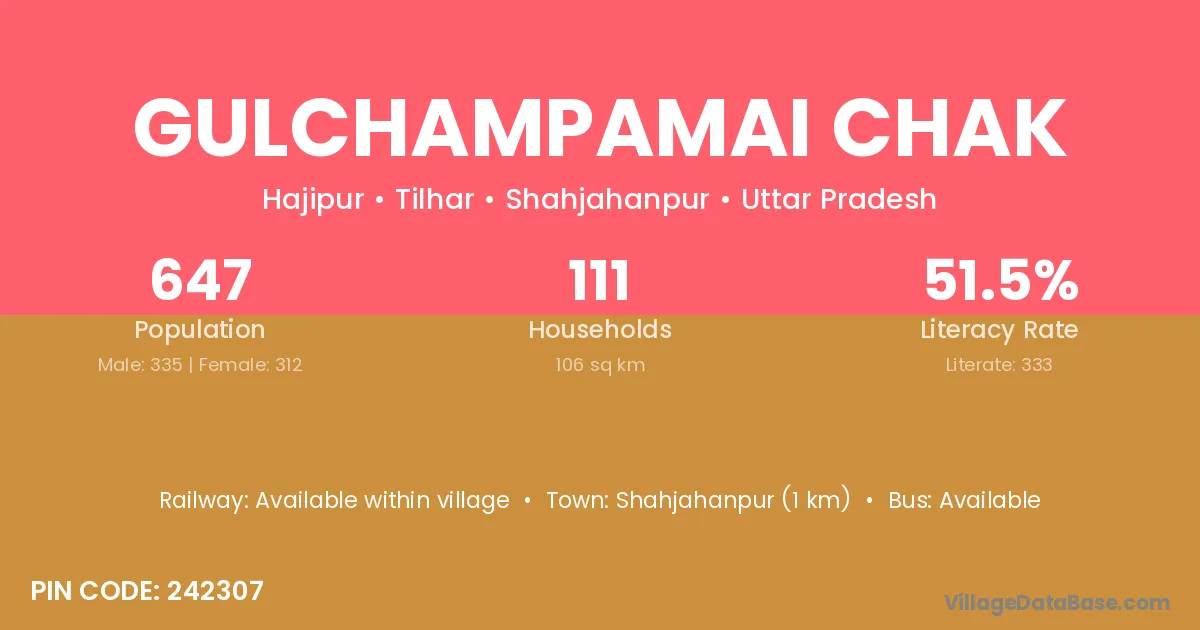Shahjahanpur (1 km) is the nearest town to Gulchampamai Chak village for major economic activities and is located approximately 1 km away.
