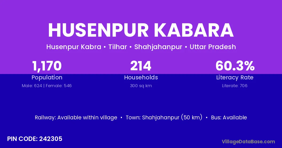 Shahjahanpur (50 km) is the nearest town to Husenpur Kabara village for major economic activities and is located approximately 50 km away.