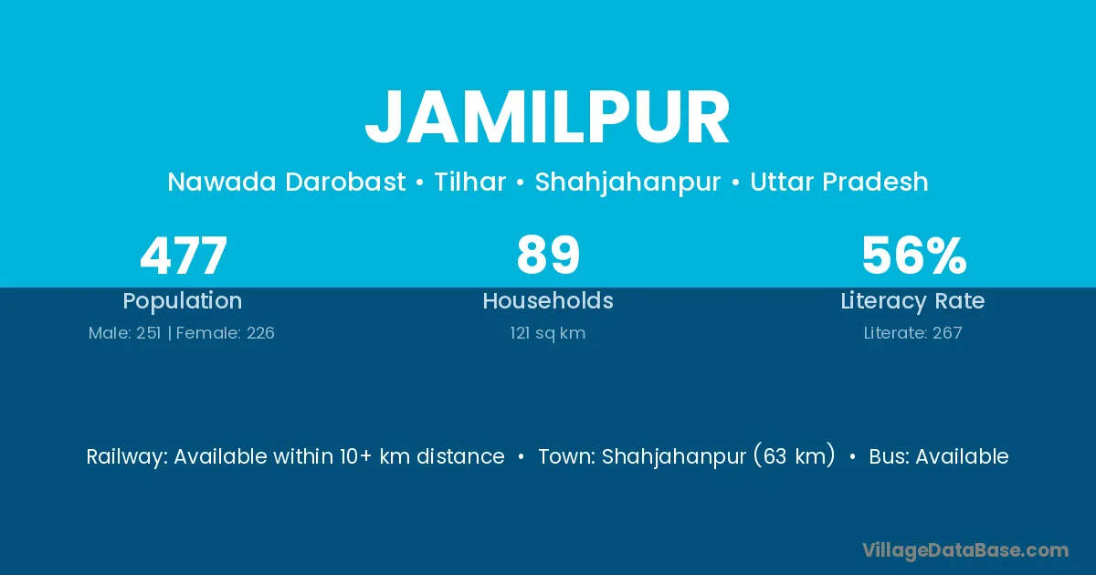 Shahjahanpur (63 km) is the nearest town to Jamilpur village for major economic activities and is located approximately 63 km away.