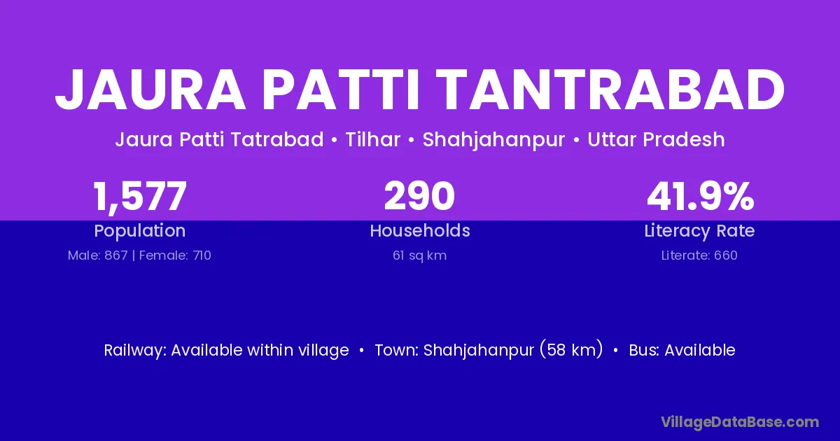 Shahjahanpur (58 km) is the nearest town to Jaura Patti Tantrabad village for major economic activities and is located approximately 58 km away.