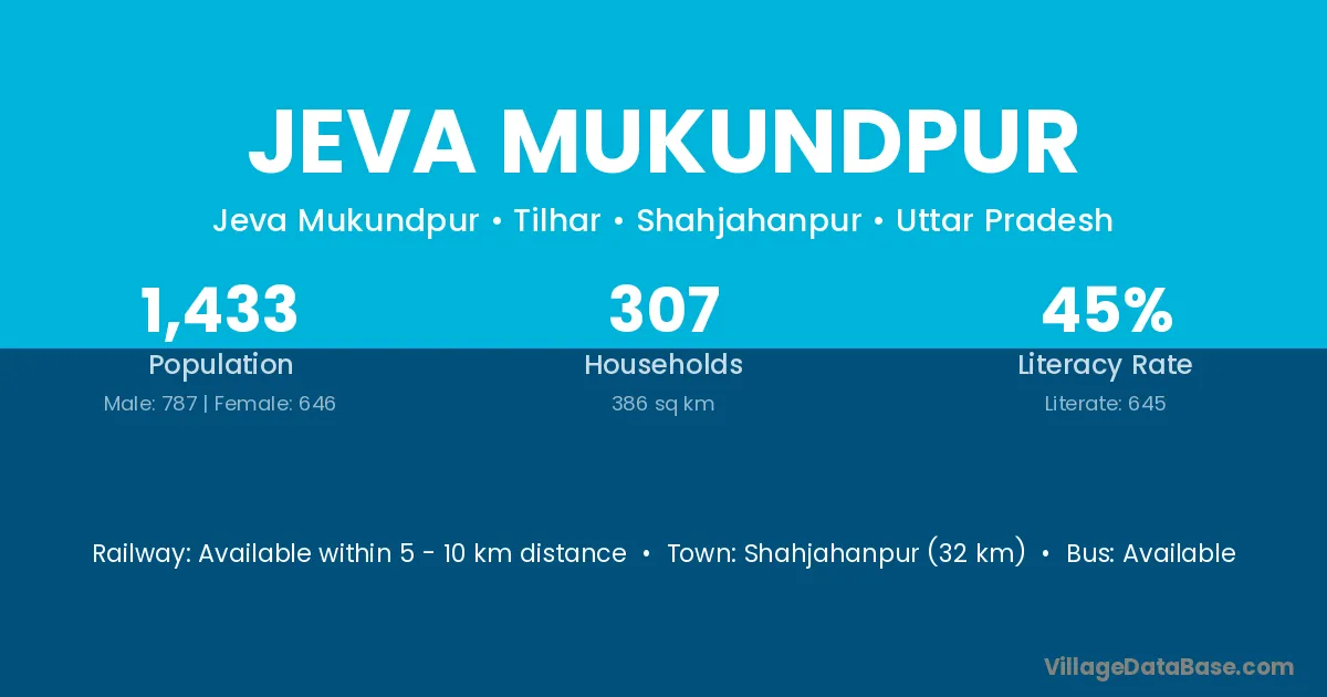 Shahjahanpur (32 km) is the nearest town to Jeva Mukundpur village for major economic activities and is located approximately 32 km away.