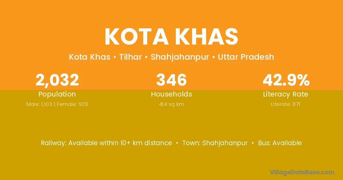 Kota Khas village has a total population of 2,032 people, of which 1,103 are males and 929 are females.
