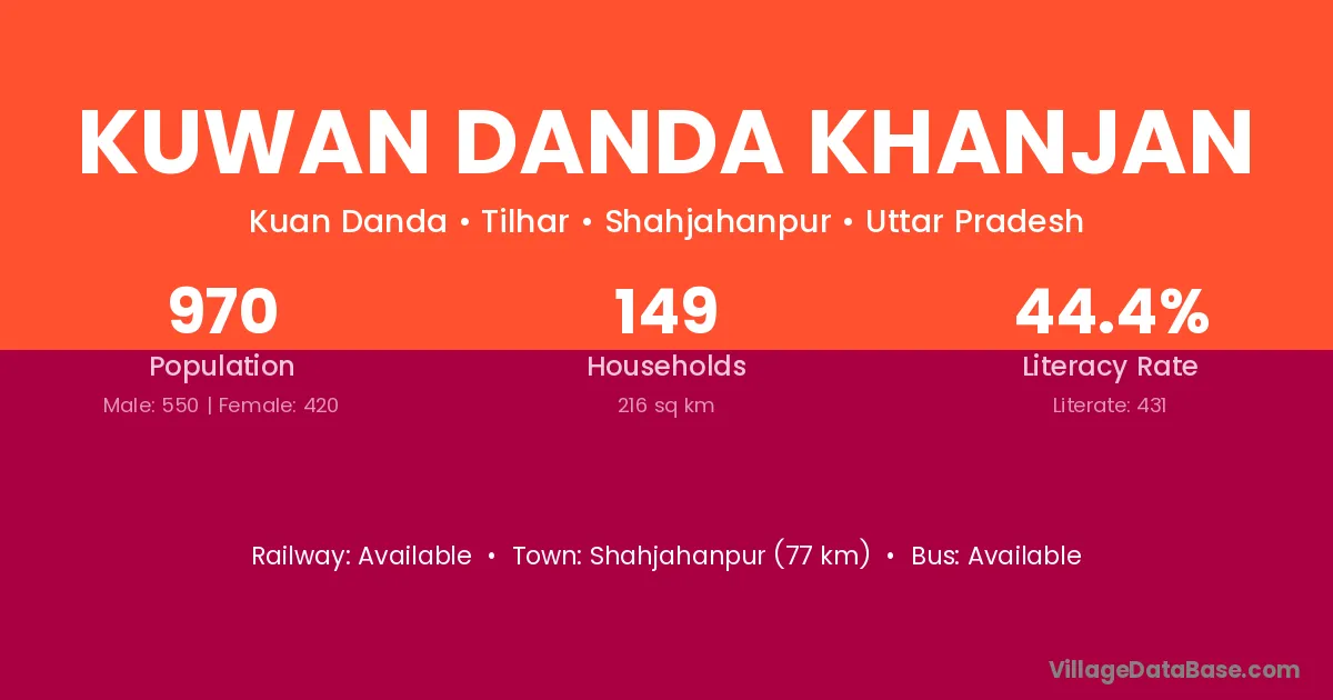 Shahjahanpur (77 km) is the nearest town to Kuwan Danda Khanjan village for major economic activities and is located approximately 77 km away.