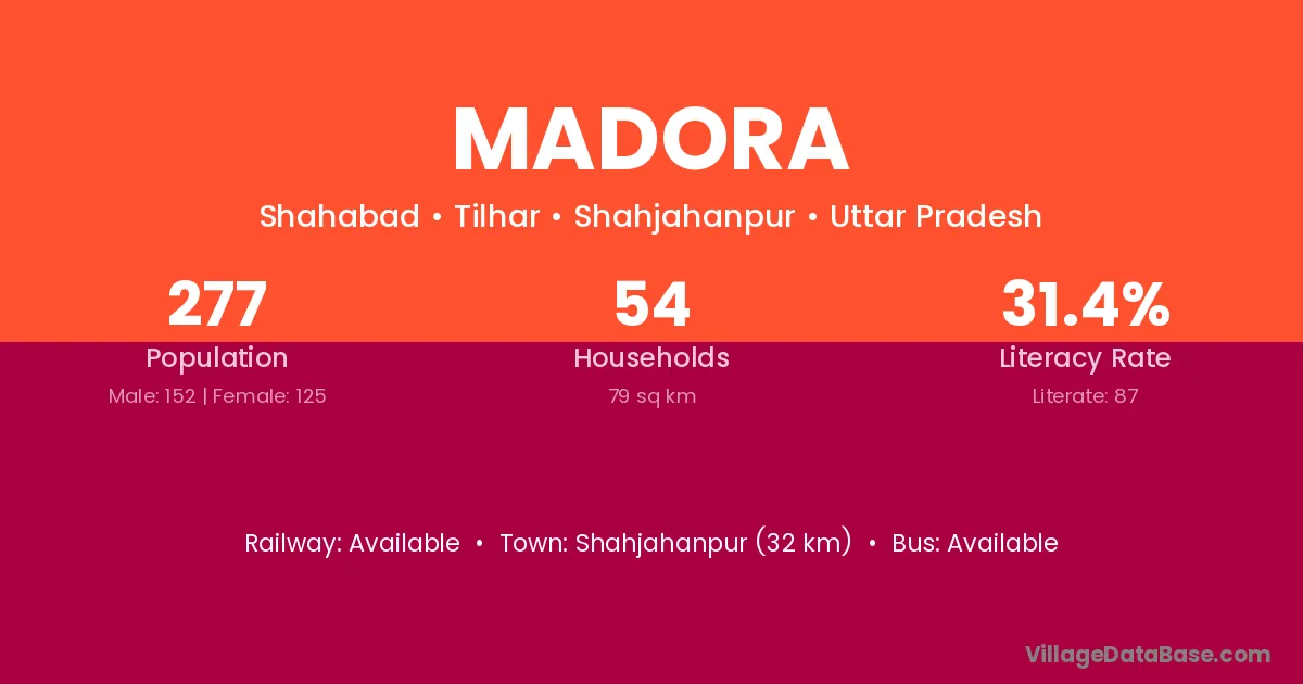 Shahjahanpur (32 km) is the nearest town to Madora village for major economic activities and is located approximately 32 km away.